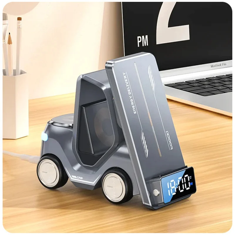 این شارژر وایرلس، استند و ساعت دیجیتال زنگدار رومیزی ساختاری منحصر به فرد و کاربردی دارد و 5 قابلیت جذاب را به طور همزمان ارائه میدهد: