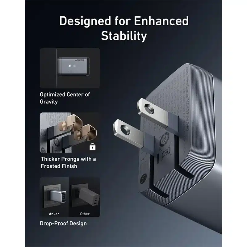 قیمت و خرید شارژر Anker Prime 100W A2688 با توجه به ویژگیهای پیشرفتهای که دارد، برای کاربران حرفهای جذاب است. توان خروجی 100W از پورت USB-C1 (بالایی) با حالتهای 5V⎓3A (15W)، 9V⎓3A (27W)، 15V⎓3A (45W) و 20V⎓5A (100W Max) شارژ سریع لپتاپهایی مانند MacBook Air/Pro را فراهم میکند. 3 پورت همزمان تا 100W (دو پورت) یا 89W (سه پورت) شارژ چند دستگاه را امکانپذیر میسازد. فناوری GaN اندازه شارژر را کوچکتر از کارت اعتباری کرده و کارایی را افزایش میدهد.